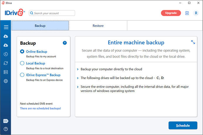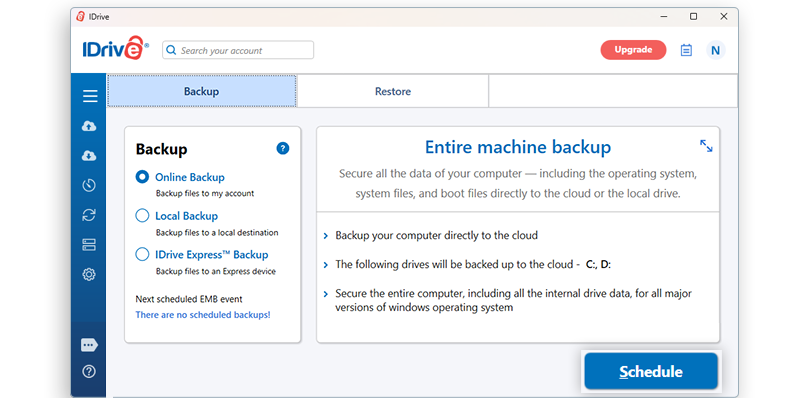 Backup the entire system, including the operating system, program files, system files, and boot files directly to the cloud, with IDrive’s Entire Machine Backup. Backup of the system and boot files ensures that the operating system works normally when it's restored.