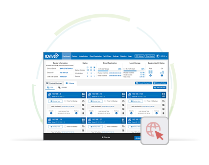 Store entire data of hard disks, including the operating system (OS) and application configurations in an onsite device, and retrieve them in case of catastrophic failure. In addition to local backup, IDrive offers cloud replication which allows you to transfer backups stored on your device to your cloud account for a better disaster recovery plan. Also, lets you maintain a ready-to-use, bare metal restore (BMR) capability with each image-based backup. You can also securely backup all your virtual machine data running on ESXi hosts and vCenter servers to the BMR device and retrieve them during any data loss.