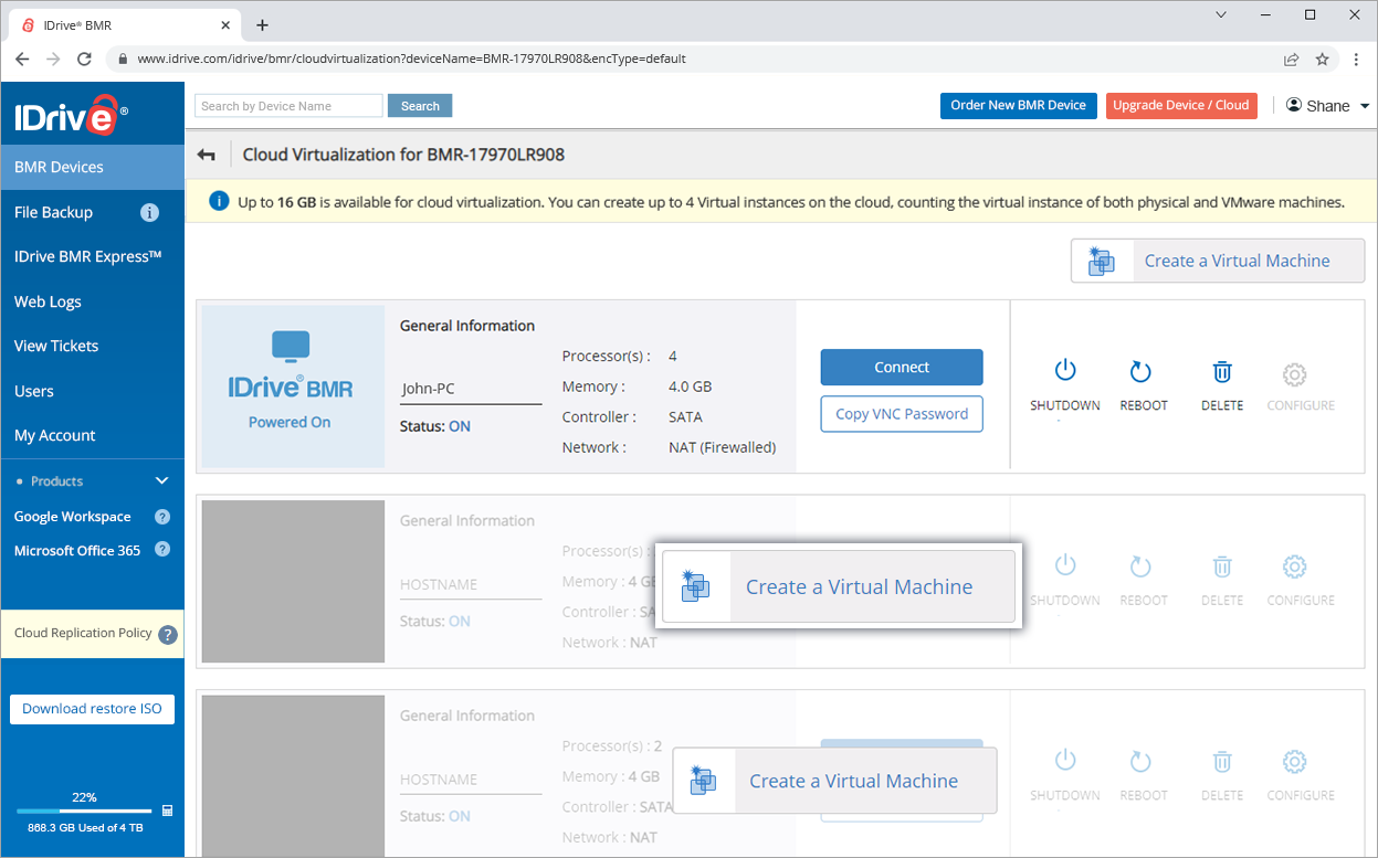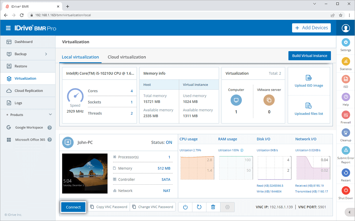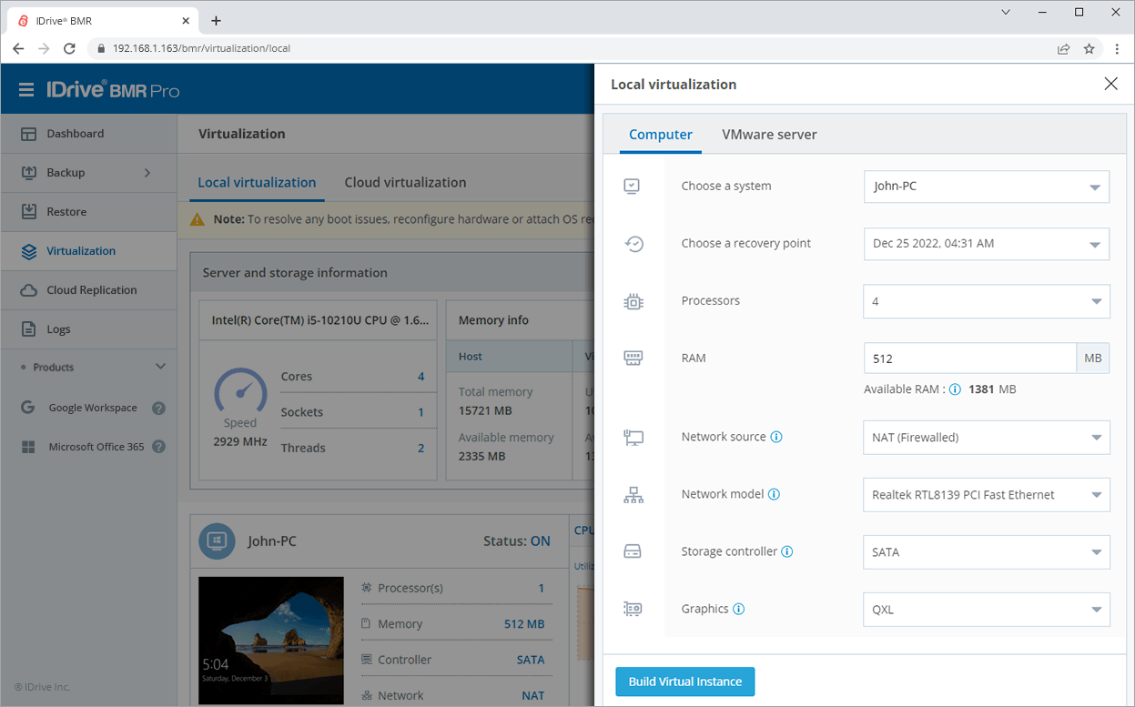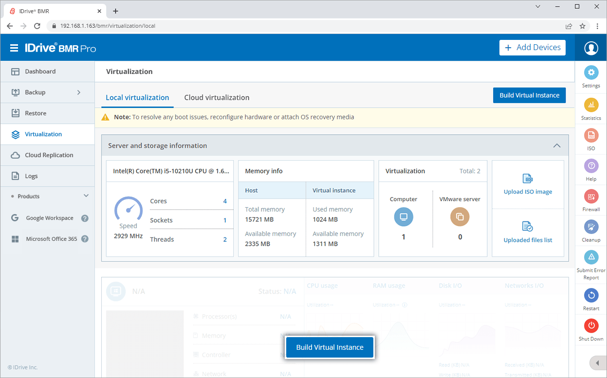 The CPU and RAM availability of the IDrive BMR devices are suitably enhanced to support stable virtualization and high performance of the virtual instances.